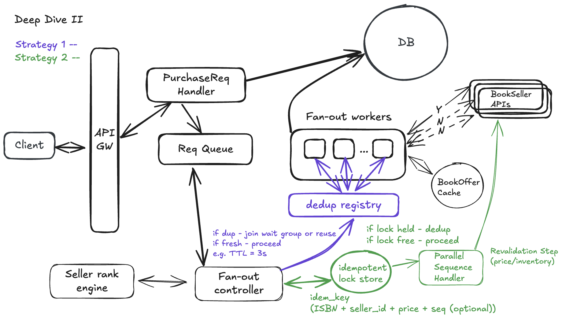 The happy path — resolving a cheap price and triggering a purchase — should be fast, cost-efficient, and resilient to noise. That’s where strategies like early-exit fan-out, seller tiering, and offer caching shine. But we also prepare for messy realities: bursty traffic, duplicate requests, flaky sellers, and overload scenarios. That’s where deduplication, idempotency, and global rate limits come in.