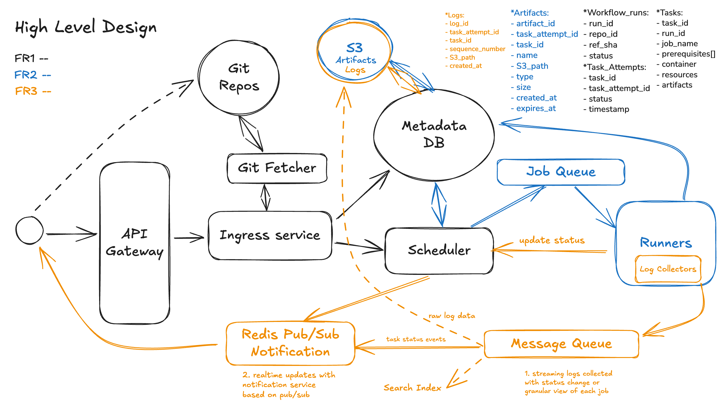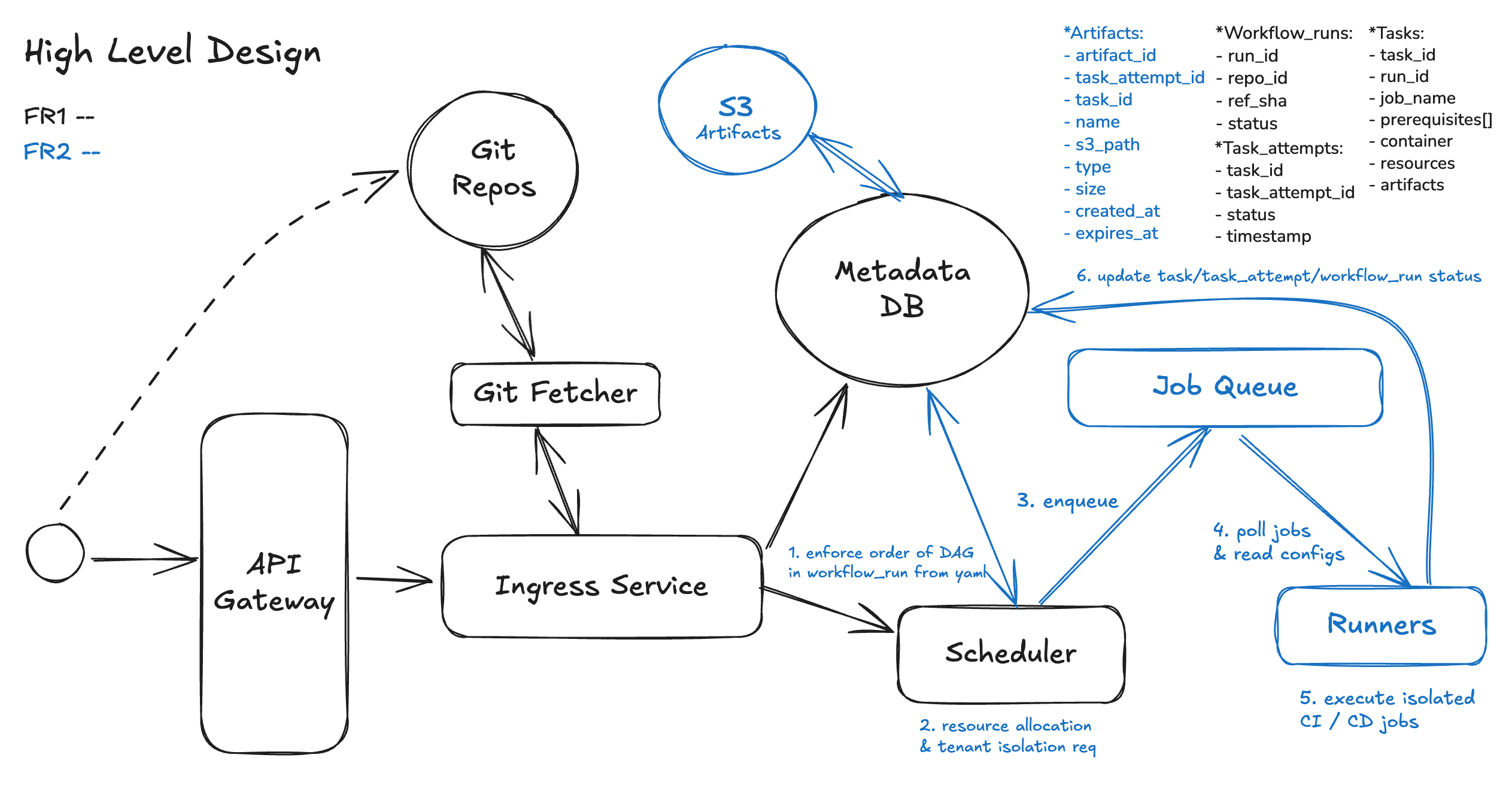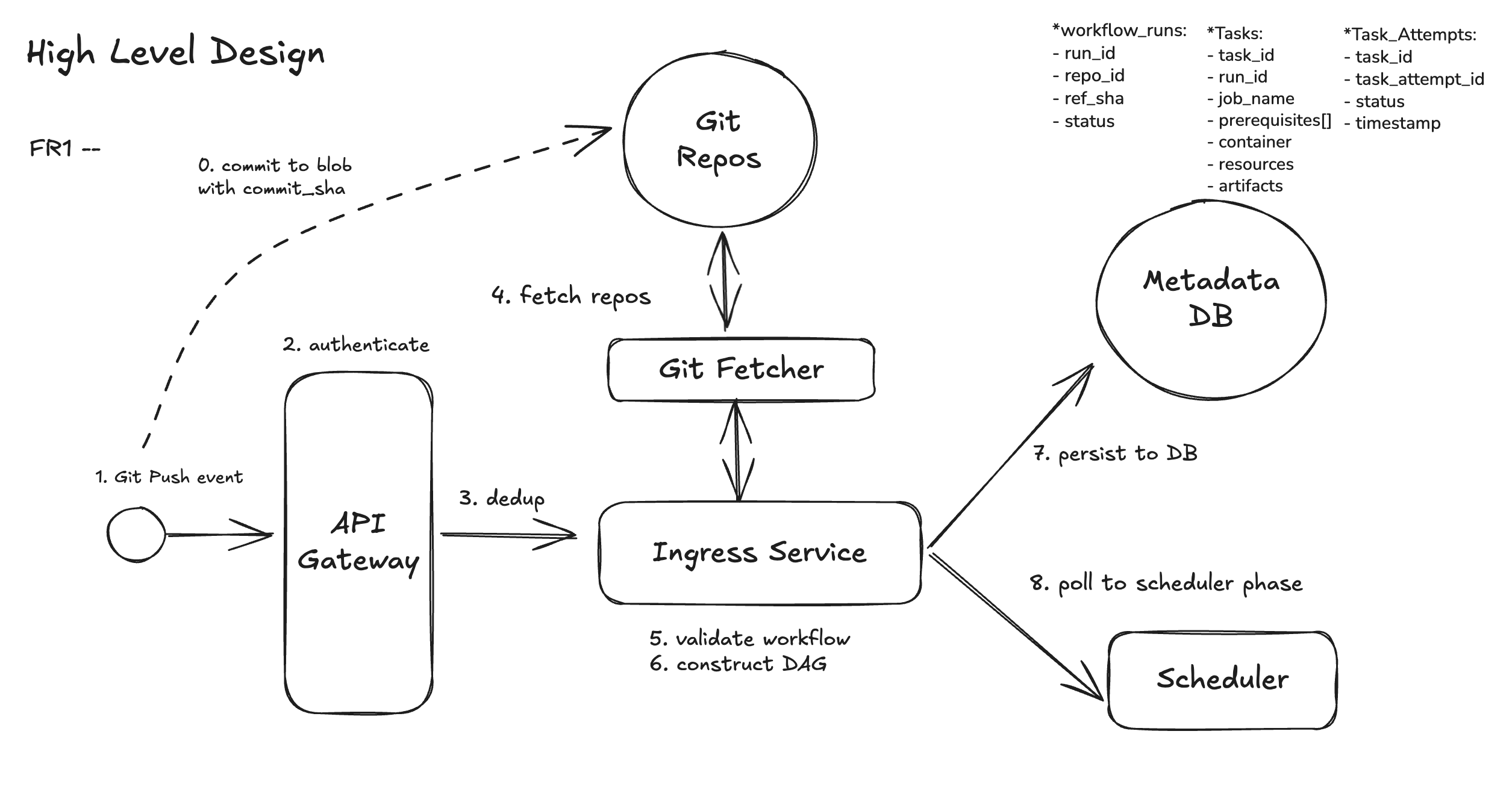 Break each functional requirement into clear, sequential building blocks (e.g., “On Git push → fetch YAML → parse DAG → enqueue jobs”). These steps form the scaffold of your design.